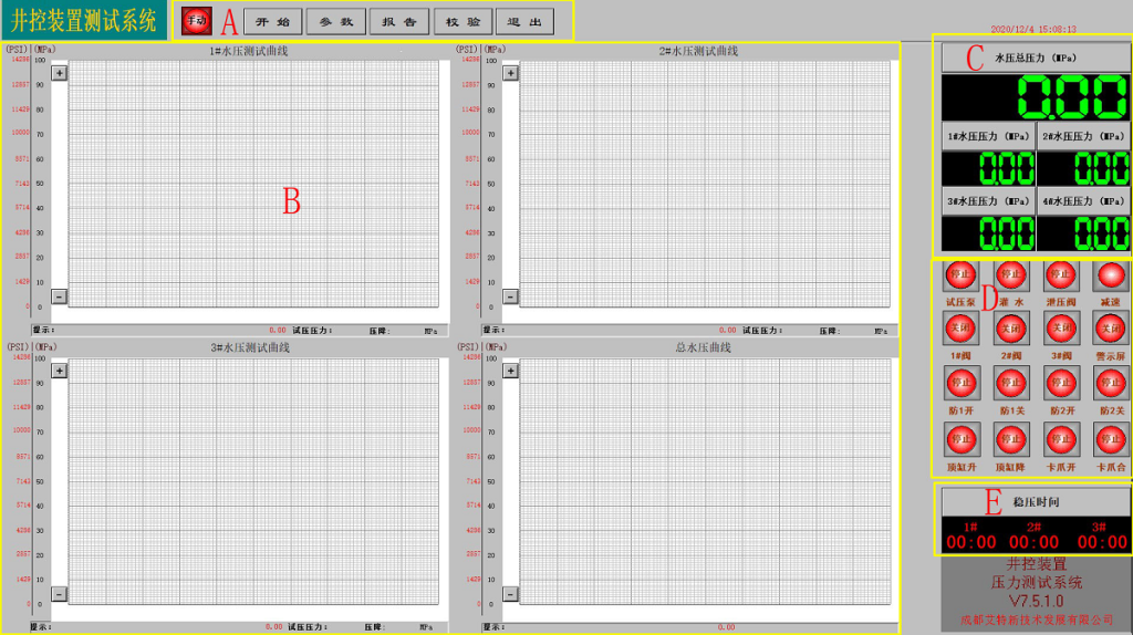 E区:各被试件稳压倒计时显示,进入稳压流程后计时牌按设定的时间倒计时,时间到达设定值系统自动打开对应泄压阀。